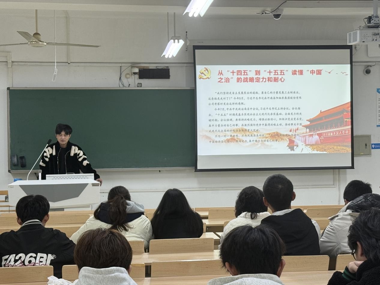本次理论学习会以“读懂‘中国之治’的战略定力和耐心”为主题,聚焦“十四五”收官和“十五五”谋划。主持人带领全体成员重温了“十四五”期间的重大事件,领略了我国在世界变革时期,“坚定信心、保持定力,集中精力办好自己的事”的成功经验;学习了习近平总书记关于“十五五”时期经济社会发展的重要讲话精神。通过学习,同学们深刻把握了我国在新时代坚持和发展中国特色社会主义的重大意义。在之后的研讨环节,全体成员围绕“在‘十五五’时期如何贡献青春力量”展开了激烈讨论。